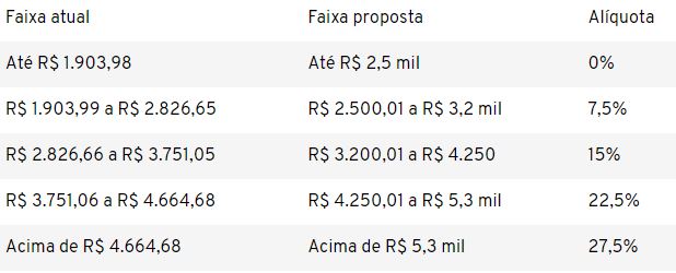 Entre as principais mudanças para a pessoa física está o aumento da faixa de isenção do imposto, que sai dos atuais R$ 1.903,99 para R$ 2,5 mil. Segundo o Ministério da Economia, hoje 31 milhões de brasileiros declaram o IRPF, dos quais 10,7 milhões são isentos. Com a atualização da tabela, outros 5,6 milhões deixarão de pagar o imposto, elevando o total de isentos para 16,3 milhões.